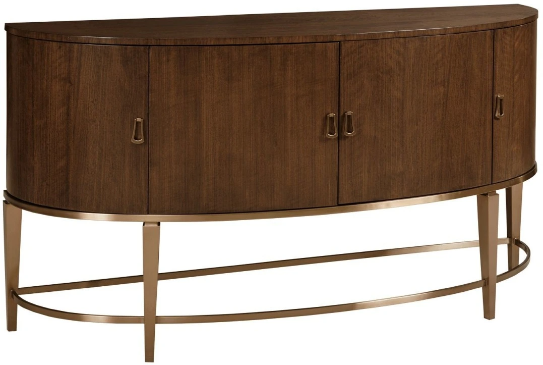 The Vantage Gardner demilune sideboard showcases a sleek metal base with two drawers and four doors. Inside, a fixed shelf offers ample storage, while adjustable levelers and rear hand holds ensure stability and easy placement.Read More