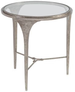 Hammered hand-forged contemporary iron base with a textured silver leaf in a silver finish, showing natural mill scale and forging marks. The End Table features shaped legs, decorative lower shelf with inset glass, and a tempered glass top.Read More