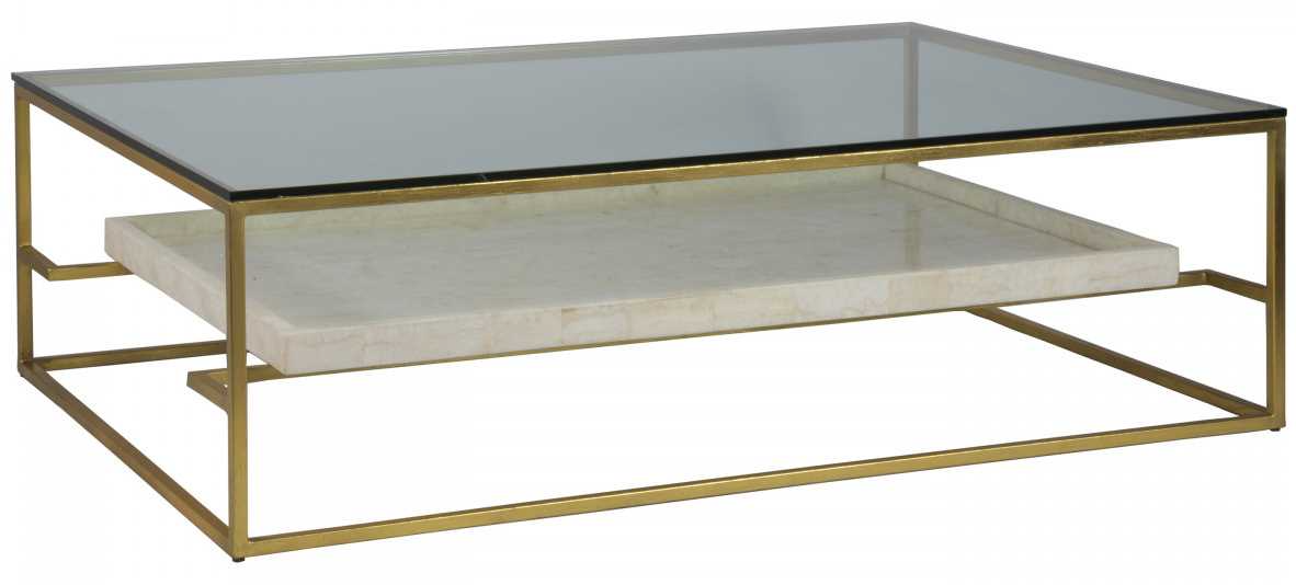 Iron base frame in a gold foil finish with a fossilized white crystal floating shelf, and lay on glass top. The fossilized white crystal stone will vary in color from piece to piece.Read More