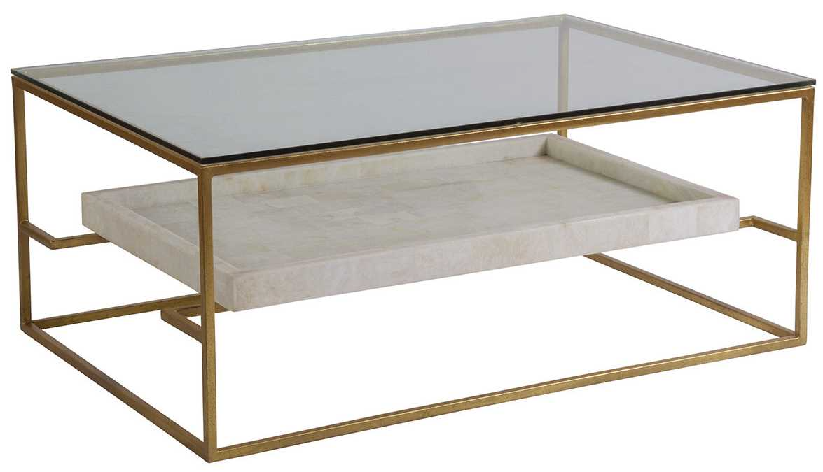 Iron base frame in gold foil finish with tempered glass top and fossilized white crystal stone floating shelf. The stone will vary from piece to piece. Designed as a striking centerpiece, it enhances any living space, making it perfect for entertaining or displaying decor with elegance and functionality.Read More