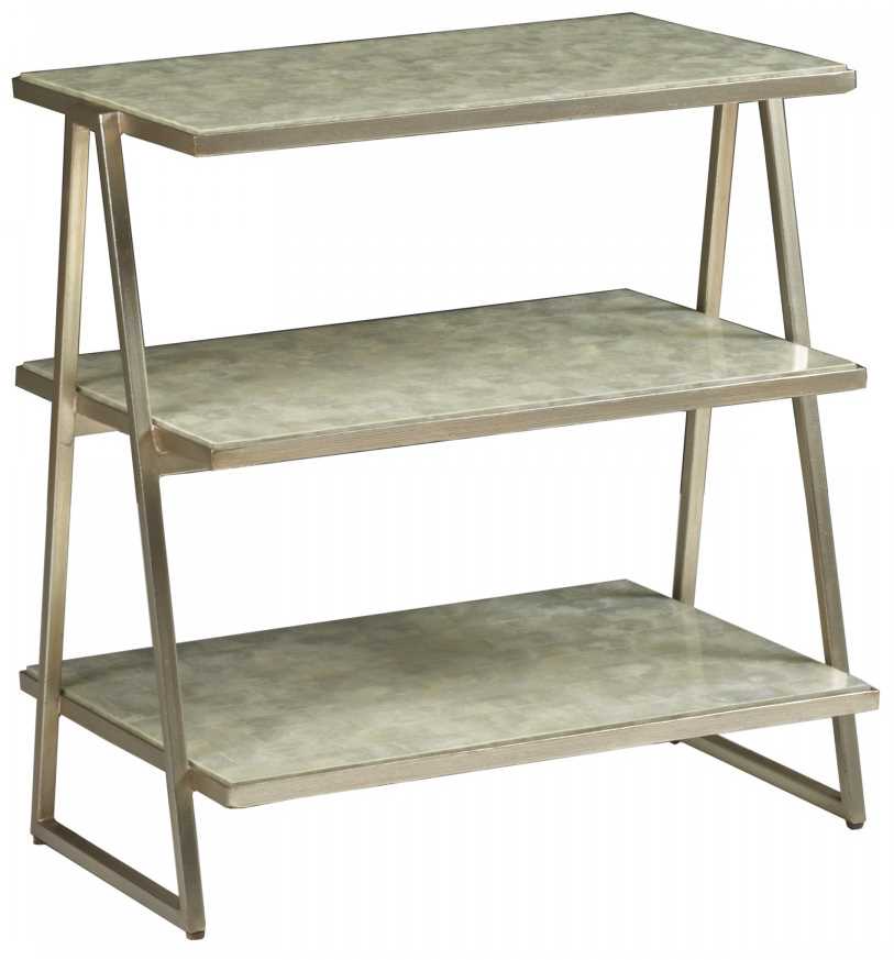 The sleek, light beauty of the design features three tiered capiz shell sheves glistening beneath the lay on glass top, and complimenting the champagne foil finished iron base. Shell shelves may vary from piece to piece.Read More