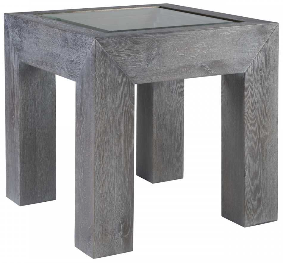 Heavily distressed and Barnyard Oak veneers in random planks with a waxed carbon finish. The parsons-style end table has concentric stepped detail and a tempered, beveled glass insert into an iron frame.Read More