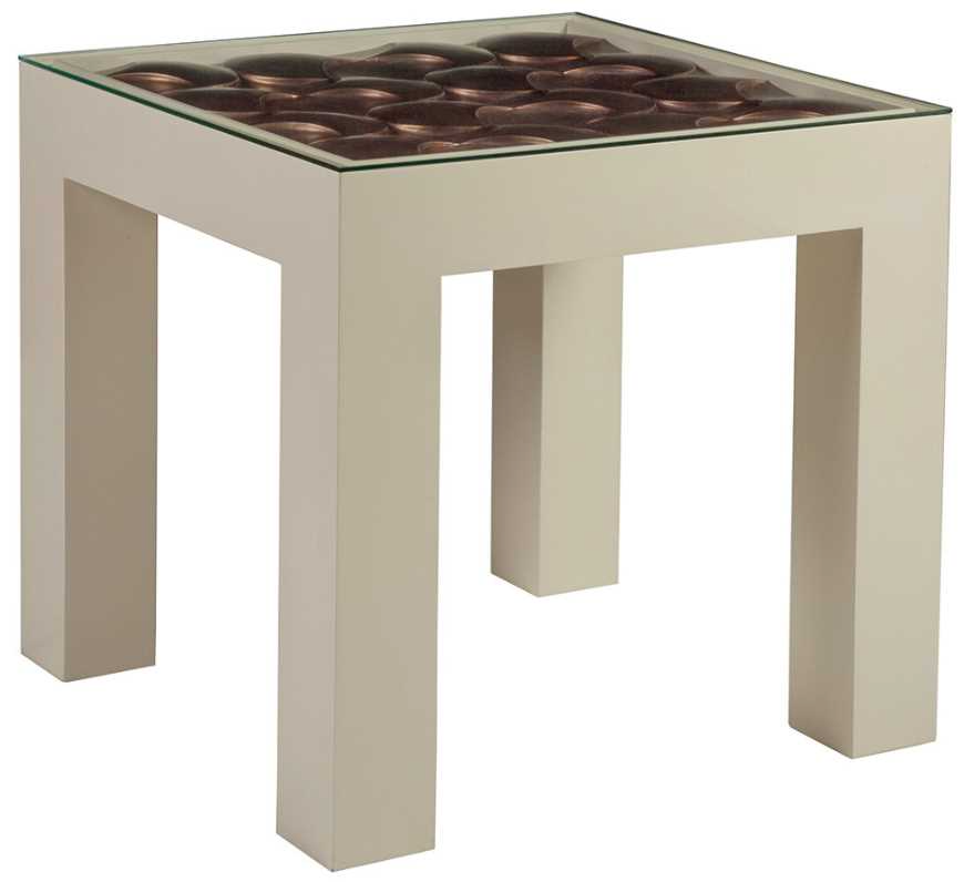 Inset tempered glass over a warm silver leaf finished cast top with an ivory matte paint and lacquered frame. Perfect for displaying decor or essentials, it seamlessly enhances any space with a refined, contemporary aesthetic.Read More