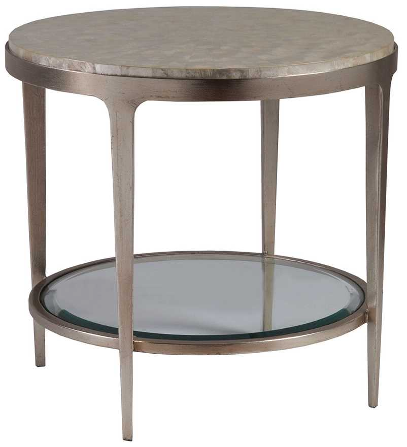 Capiz shell inlay top graduating to a center sunburst pattern on a hand-forged iron base in a champagne foil finish, with a tempered inset glass shelf below. Shell is a product of nature and may vary from piece to piece.Read More