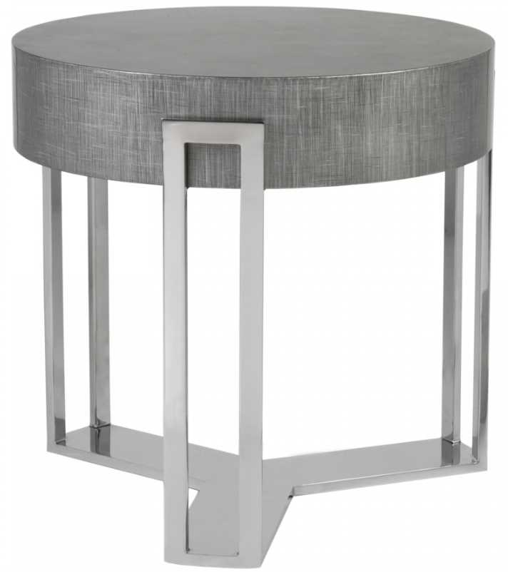 Contemporary design slab top is Beech solids and Maple veneers hand-painted by artists in a gray and silver crosshatch pattern over a silver leaf, enhanced by a true lacquer finish. The polished stainless steel sled base has cutouts on the posts.Read More