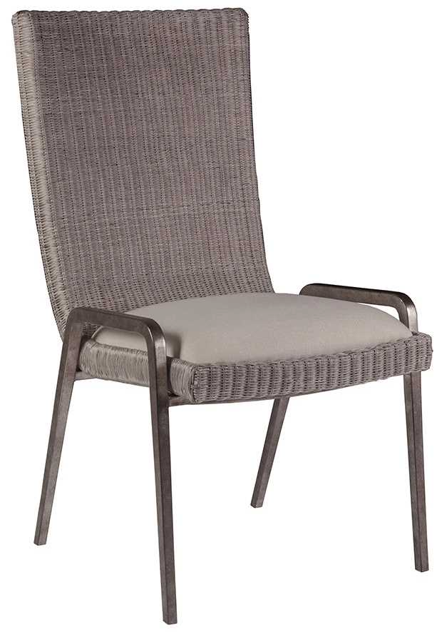 Woven wicker on a tapered iron frame finished in an antiqued silver leaf. The upholstered seat is available as shown in fabric 153711, a linen weave with a soft hand in a natural vanilla coloration.Read More