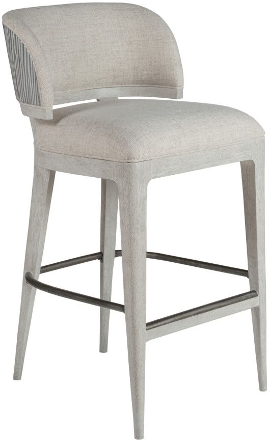 Contemporary stool in solid white oak, in our Misty White Gray and featuring cast inserts on the outside backs, in an organic pattern finished in silver leaf. Upholstered seat and inside back. Outside back is cast in an organic silver leaf finish.Read More