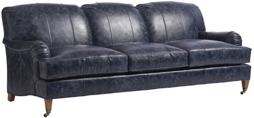In similar fashion, the top back rail above each of the three seat cushions on the sofa features a gentle arch in the back. Metal ferrules and casters are offered in your choice of aged brass (B) or pewter (P). The exposed wood leg also allows for customization, with over forty finishes from which to choose. This series is available in both fabric and leather.