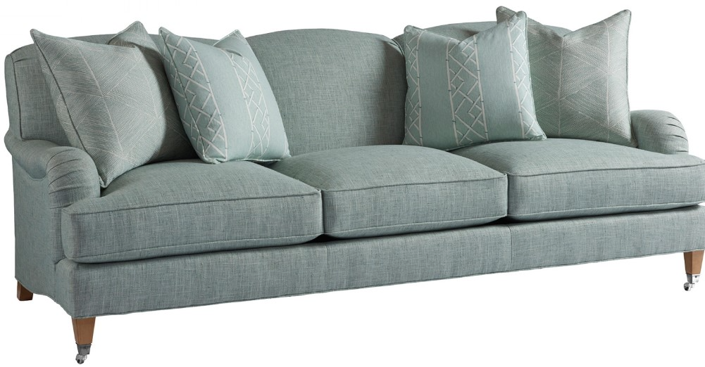 In similar fashion, the top back rail above each of the three seat cushions on the sofa features a gentle arch in the back. Metal ferrules and casters are offered in your choice of aged brass (B) or pewter (P). The exposed wood leg also allows for customization, with over forty finishes from which to choose. This series is available in both fabric and leather.