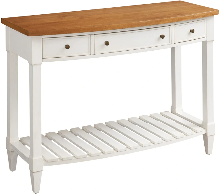 The 48-inch Temple bowfront console is a great size for use as a serving piece in the dining room, or as a console table in the hallway or living room. The piece has three soft close drawers, a wooden slat shelf at the base, and finished back.Read More