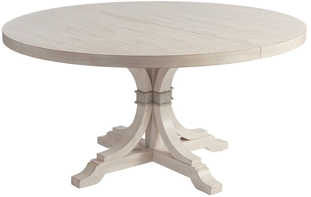 The 60-inch diameter Magnolia dining table extends to 80-inches with the leaf inserted, offering comfortable seating for six. The graceful shape of the pedestal features a decorative metal collar in an aged bronze patina.Read More