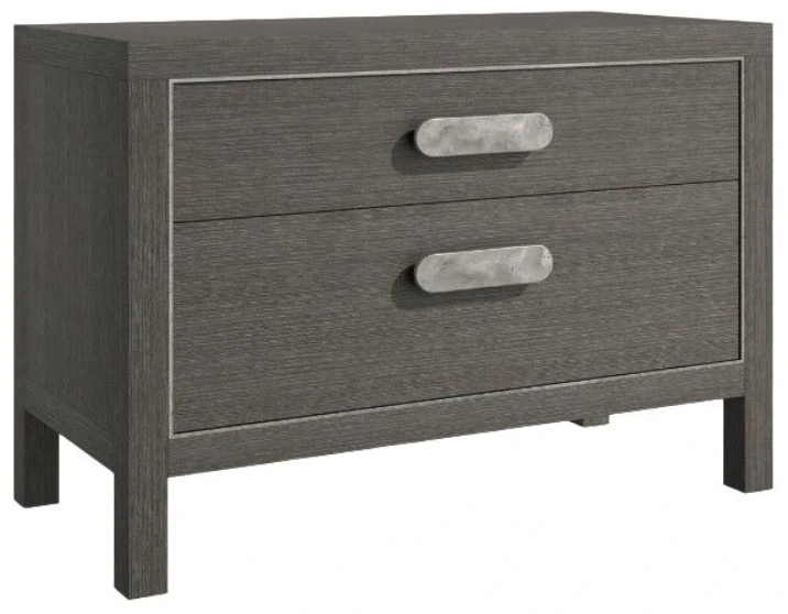 The deep Porcini finish on the Prado nightstand is balanced with the gleam of metal details. Two drawers offer storage, with the drawer boxes outlined with an inset metal frame in Bright Graphite finish. A two-port USB charging system is included on the back of the case.Read More