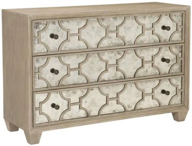 For a vintage look, the three drawers feature antiqued mirrored glass with arabesque cast grille overlays. With its clean form and refined touches, this eclectic piece evokes a laid-back California vibe.