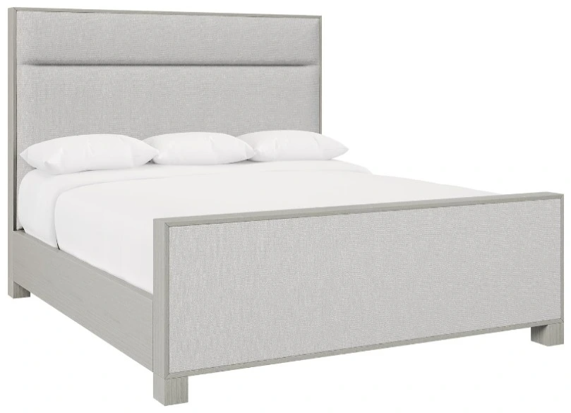 Straight lines make a modern geometric statement for the Stratum panel bed. An exposed wood frame in the Mist finish wraps around inset upholstered panels in the headboard and footboard. A deep fold in the headboard offers an elevated design aesthetic with an understated glamour.Read More
