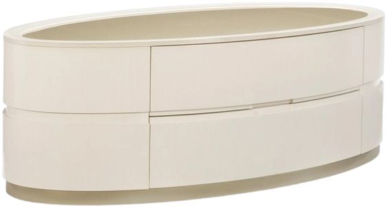 The Adela Oval Cocktail Table has modern neoclassic features and is beautifully detailed with a beveled glass top that reflects shimmering Blush Taupe paint underneath. The piece has two drawers; the top drawer’s interior has Blush Taupe metallic stencil details.Read More