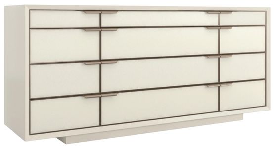Casting a warm glow, metal drawer trim in champagne gold artfully incorporates soft edge pulls. This piece offers generous storage with soft-closing features and two felt-lined top drawers for an added note of luxury.