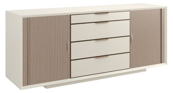 A masterful mix of form and function, this mid-century-inspired console stirs interest with its linear design and host of storage options. Sliding tambour doors in moonstone add texture and contrast to an almond milk finish.Read More