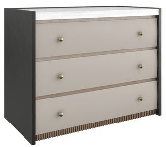 With a rustic elegance reminiscent of rural France, this nightstand features tactile drawer fronts in a Rockport Burnished Adobe finish. Drawing the eye to its architectural design: a striated white onyx marble top, warmly contrasted by end panels in Craftsman Bronze Paint and an Antique Bronze Leaf dentil molding detail along the base.Read More