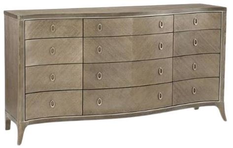 This generous dresser stands out with its lyrical serpentine shape. The grain of quartered ash veneer is arranged in a chevron pattern and brought to life with an elegant linen finish. Custom contemporary oval metal pulls add the perfect punctuation to the 12 self-closing drawers that are finished in pearl.Read More