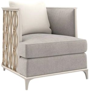 The inside back and seat cushion are finely tailored in a silver micro-chenille performance fabric with gold foil accent yarns for added glimmer.
