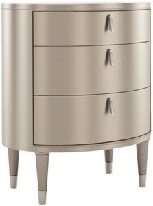 Oval-shaped nightstand adds soft curves and subtle shimmer to bedroom interiors. Finished in an alluring soft silver paint, it adds a note of glamour, accented by metal ferrules in polished stainless steel. Features three soft-close drawers to neatly keep bedside essentials, books, and magazines.Read More