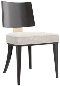 A dramatic reimagining of a modern, Klismos style, this dining side chair draws the eye with brushed gold back splat articulated by a Palladian arch. Its sleek upholstered seat lends striking contrast to splayed back legs and a gracefully curved, bentwood outback in an almost black finish.Read More