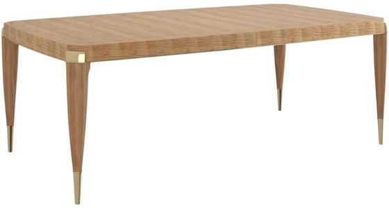 For large dining parties, this Toasted Sycamore table is unmatched. The delicately figured wood, in a bowed rectangular shape, has graceful chamfered corners detailed with outstretched, Whisper of Gold metal caps. The entire apron is rimmed in a thin Whisper of Gold bead as it sits on modern cabriole legs tipped in custom gold ferrules.Read More