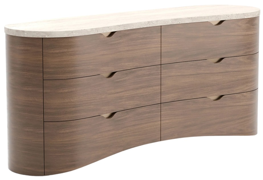 Elevate your bedroom with the sophisticated Fleur Dresser. Crafted with an exquisite, unfilled Travertine stone top, each dresser offers unique natural beauty marked by variations in color, veining, and subtle detailing. Its refined Porcini-finished case complements any decor style.Read More