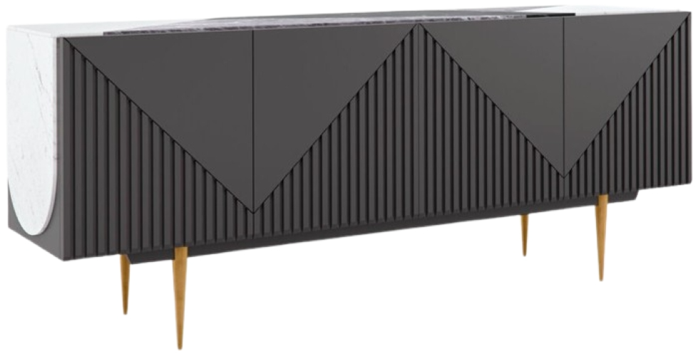 Bring a modern form to traditional dining with our Over the Edge buffet, finished in Warm Slate and a mix of polished marble and stone. Graphic slat details add dimension to this contemporary design, balanced on tapered metal legs in Champagne Gold.Read More