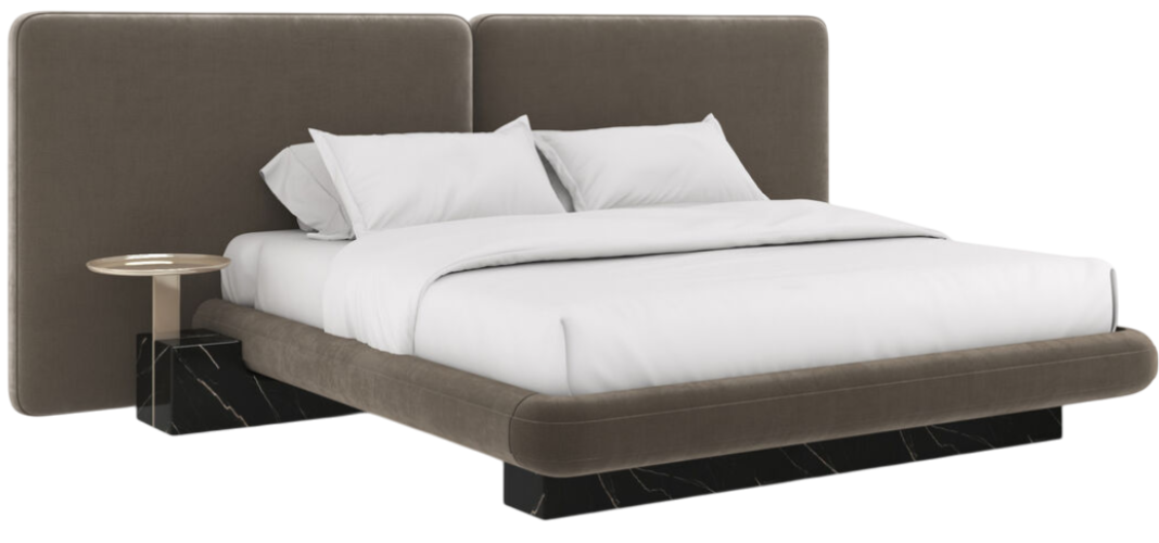 This fully upholstered king bed in dark taupe vintage velvet features distinctive exposed whisper of gold metal accents and a bold nero marquina stone base, combining rich materials for a striking presence.Read More