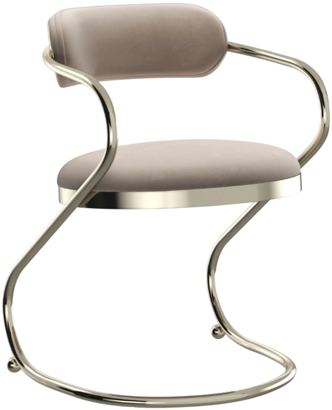 Art and architecture come together in Retrospect’s eye-popping continuous line of tubular metal in Whisper of Gold that supports a cantilevered seat. Contrasting with the austere use of the metal frame are the tight upholstered seat, outback, and inside front in comforting light taupe velvet.Read More