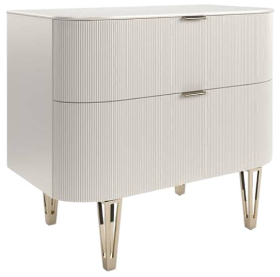 Cap the sides of your favorite bed with elegant nightstands that are just as dreamy. This 32 inch version boasts a fashion-forward design with a softly rounded profile accentuated by matte pearl finish, exquisite fluted sides and vinyl wrapped drawer fronts. Lustrous from every angle, it features a sophisticated palette of finishes.Read More