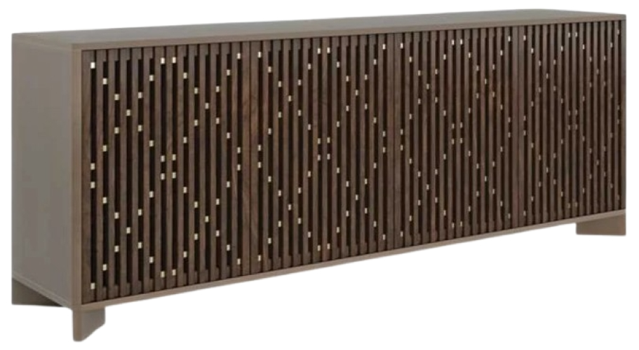 With a striking composition and material mix, this media console takes inspiration from a piece found while strolling the antique markets in Paris. Encased in brushed antique brass paint, linear door fronts feature a slatted wood construction, separated by cube-shaped gold metal spacers to create an argyle diamond pattern.Read More