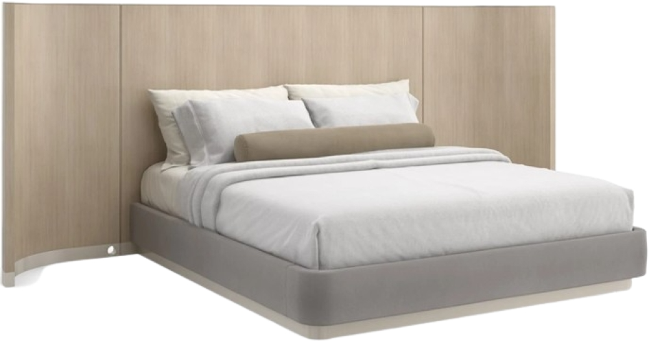 Wood-paneled wings with a subtle curvature add to its warm and welcoming aesthetic, complemented by a softly rounded footboard and side rails in a pale gray mohair fabric. Also available without wings.
