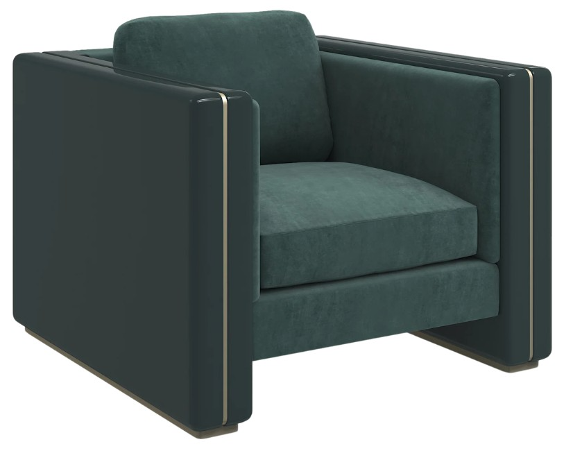 This chair will make you green with envy. Peacock angora-like velvet sets this mid-century piece apart. This square-armed chair showcases a fully-upholstered and inviting seat that is topped with a single loose spring down cushion and one loose blend down pillow backs in matching fabrics.Read More