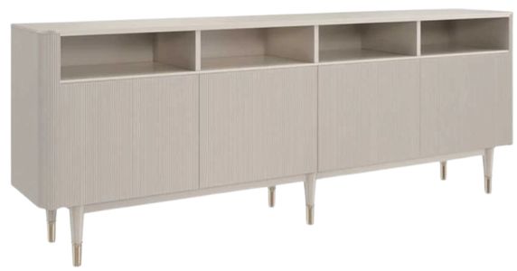 Tactile reeded door fronts in a matte peal finish emphasize this linear design, with a modern-yet-elegant aesthetic that blends with entryways, living or dining interiors. Open cubby spaces offer easily accessible storage above four, touch-latch doors, neatly concealing a matte pearl-painted interior with adjustable shelves and cutouts along the back for cord management.Read More