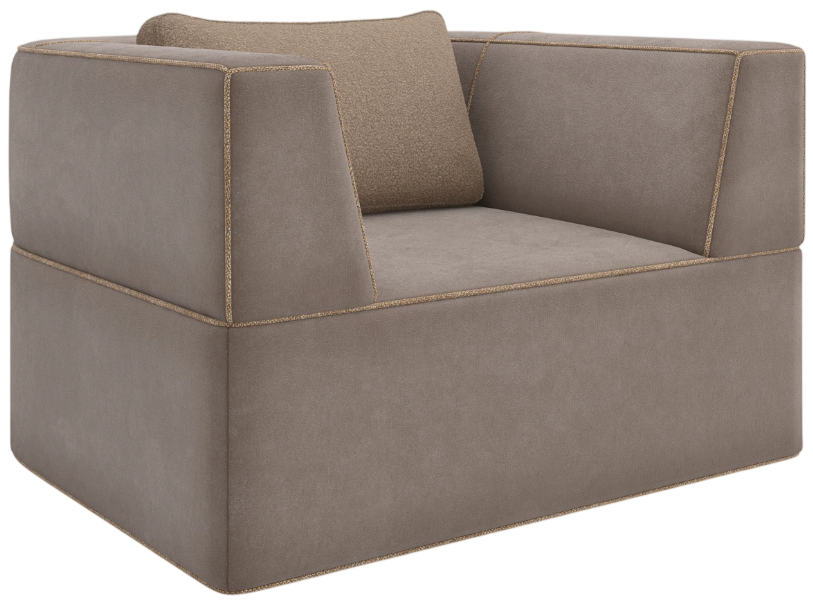 Fully upholstered in a warm gray faux nubuck fabric, its enveloping, modern form is accentuated by strategically placed seams and a saffron-colored contrast welt.