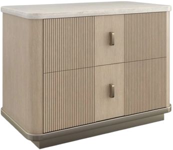 The natural beauty of Sun Drenched oak and a creamy Travertine stone top is punctuated by the visual rhythm created by reeded drawer fronts. Rounded corners and bronze drawer pulls with a subtle contour soften its linear form and add a touch of warmth.Read More
