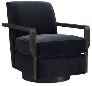 This open-arm swivel chair has a notched back to hold the cushion in place and ensure its stylish comfort while exposed wood arms wrap around the back in a seamless racetrack design. Its metal swivel base features a Remixed Gold Paint finish. Only a design as unique and distinctive as this Rewind chair can help you find a sense of adventure in the everyday.