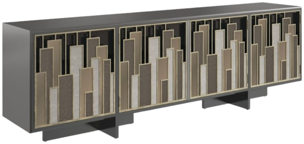 With an air of sophistication and modern luxury, this console calls to mind a dazzling city skyline at night. Uniquely crafted, its four doors feature inset panels with layered geometric shapes in a glimmering mix of metal finishes. Offers streamlined, tucked-away storage with four drawers and an adjustable shelf below.Read More