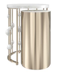 Inspired by celestial bodies, this nesting set of tables makes a dually dazzling accent. The larger accent table features a White Rhino marble top, balanced atop a reflective metal base with orbiting spheres of carved stone. Also topped in marble, the smaller accent table tucks neatly inside the larger table, adding warmth and glimmer in a Whisper of Gold.Read More