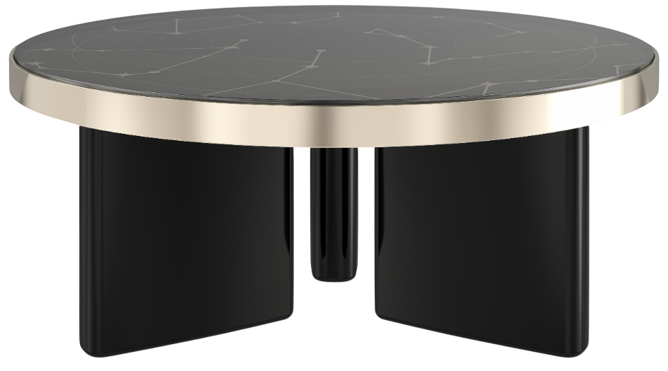 Top is piano black with silkscreen constellation pattern in whisper of gold and silver shadow.