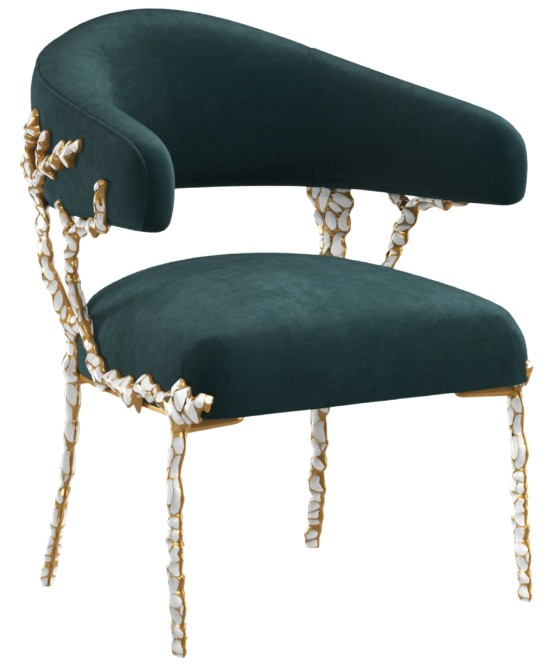 This dazzling chair is unique in every way. Its one-of-a-kind shape was born from design exploration of the organic beauty and inspiration found in nature. Cast in solid brass and finished in Gold Brush with white enamel, it has the feel of branches or coral reaching up toward the light.Read More