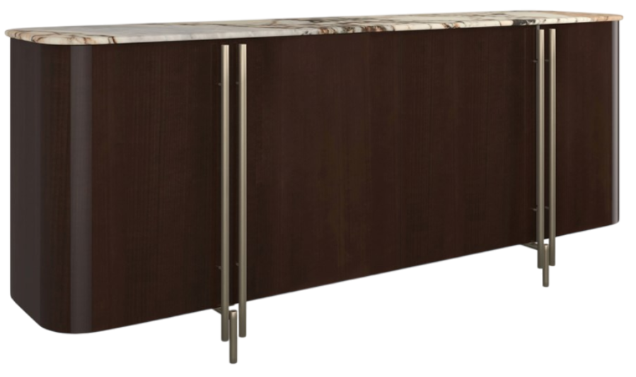 Calcutta viola stone, with its richly figured veins in plum, burgundy, inky browns and blacks, is the visual centerpiece of this sideboard. The stunning slab of oval stone rests on a cabinet with bullnose corners of hand-applied tupelo veneers finished in sultry otter gloss.Read More