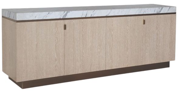 The Cadence Credenza features a thick, Carrara marble top set off from the case by a band of antique brass trim. Oak solids and narrow heart oak veneer finished in a luminous Sand Cerused finish envelop the four door base, all resting on an antique brass plinth base.Read More