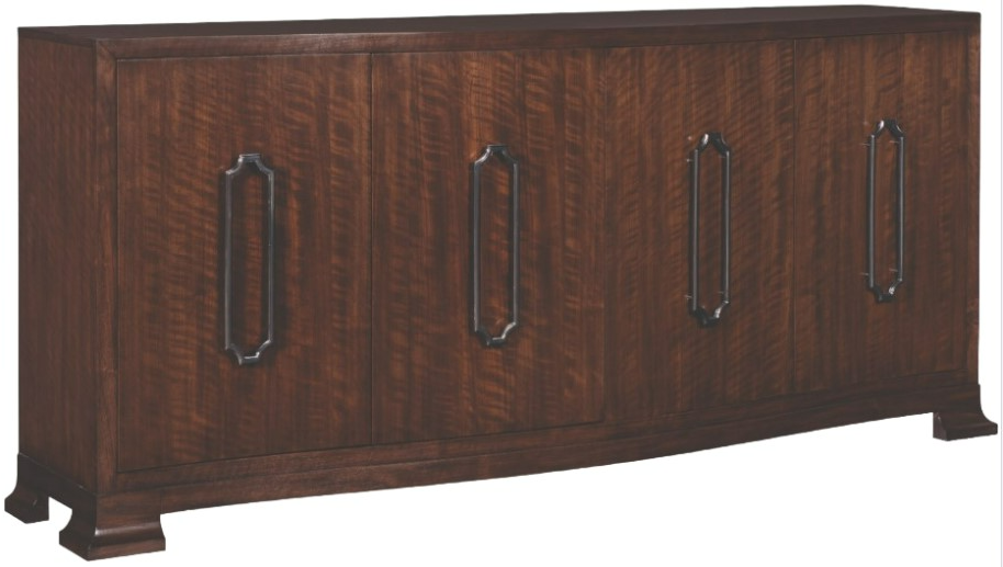 Crafted from Walnut and Poplar solids and figured walnut veneer, the Adrian Credenza features a serpentine shape design with figured walnut veneer in a vertical pattern. Elongated, pewter hardware on each of the four doors has a clipped corner motif seen throughout other items in the Citation Collection. Behind each end door are two adjustable shelves.Read More