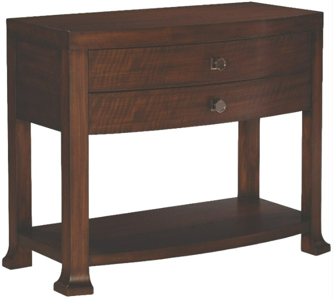 Crafted from walnut and poplar solids and figured walnut veneer, this nightstand has a shaped, bow front design with two drawers featuring a pewter knob and square back plate hardware. Perfect for any bedroom, it seamlessly blends beauty with practicality.Read More
