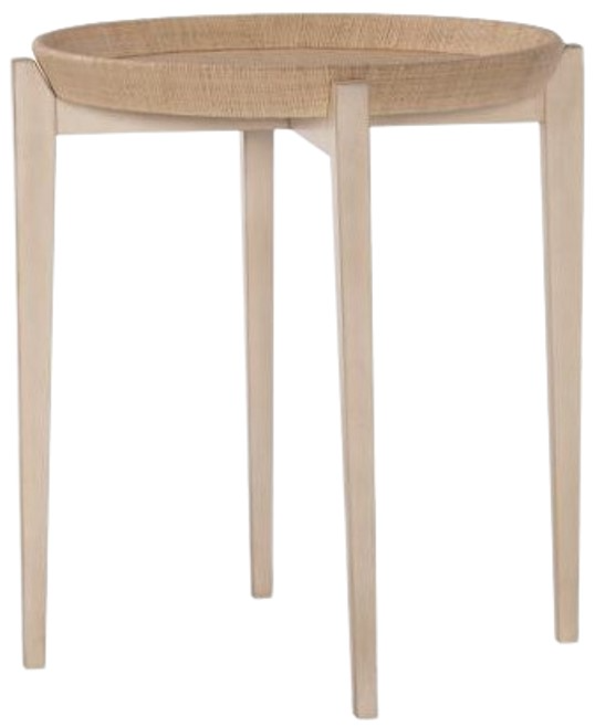 A four legged base crafted of Mahogany solids in the Peninsula Finish, an off white with grey undertones, holds a removable tray top wrapped in fine Saguran raffia in a Natural Finish. Three sizes allow you to create a nesting series or use alone as a pull up drinks table.Read More