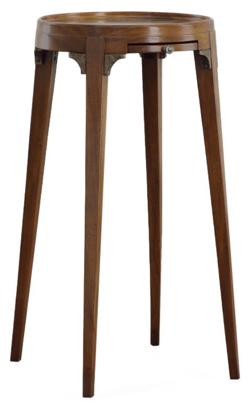 The Chapman chairside table is made from solid mahogany and walnut placage with a warm molasses finish. The top features a bronze metal inset above a pull-out drinks tray with a pewter knob. Pewter accents also embellish the tops of each leg.Read More