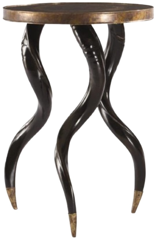 The Faux Ebony Chairside Table is created from casting real horn in a composit resin to duplicate the caracter of the original horn finsihed to a deep ebony color. The three cast horns make very interesting legs which are tipped in brass. The top is hand worked brass then finsihed in a beautiful antique brass.Read More